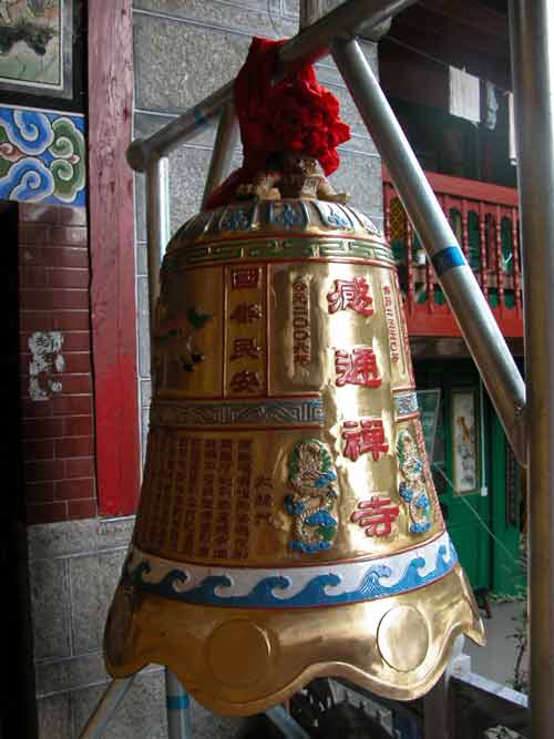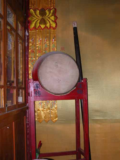 殿前左廊,有重达五百公斤铜钟,殿之右廊,原有直径五尺的大鼓,如今钟尚在而鼓已不存。