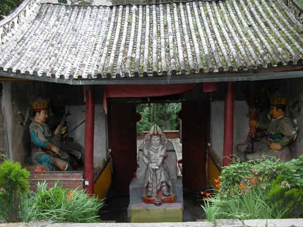 在众多的寺庵中,最负盛名的是感通寺。寺在大理市观音塘村后,苍山圣应峰麓。从观音塘下车,穿过村子,向苍山进发,约两公里即达。山寺前满坡茶园,清翠碧绿,清香扑鼻。感通茶,在南诏时代就有种植,举首看苍山,峰峦挺秀,感通寺处在一片苍松古柏之间。原规模较大,殿阁层叠,寺僧众多,今只剩大殿一座及侧房二所,僧尼四、五。塑像均为近几年群众自发修复,穿寺而上,见一片残垣,约有数十院,间有高大的柏树,可以窥见当年的规模。