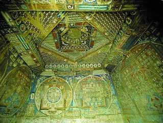 我们当即请她带路,驱车前往东嘎。在距离村子不远处的一座“U”字形的山崖上,分布着一字排开的十多座大小不等的洞窟。登上山 去,果然在其中的三座洞窟(后来分别编号为东嘎第一、二、三号窟)内发现了保存得十分完好的壁画。其后,在与东嘎相距约2公里的皮央,也发现了多座残存有 壁画的石窟。