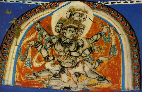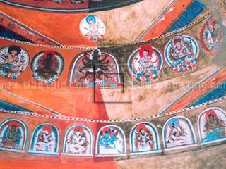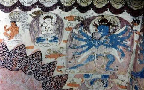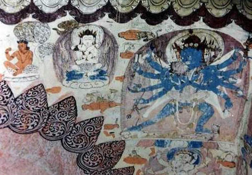 此外,在造型艺术上最富于变化的,则 是各类女尊(女神)像。石窟壁画中所绘的女尊像,有不同的种类,一类为金刚女,如东嘎1号窟西壁上所绘的各种金刚女神像;一类为供养天女,包括供香天女、 供花天女、散花天女、吟歌天女、善舞天女等;还有一类为各种度母、佛母。这几类女神像造型生动变化丰富,是西部石窟壁画中最为精美的部分,表现出很高的艺 术水准。她们的服饰特点基本上相似,通常都是头戴花冠或宝冠,耳饰大环,佩带有项饰、臂钏、手镯、足镯等饰物,肩披条帛,天衣飘飞,上体或全身赤裸,手结 各式手印或持法器,在画法上,画匠们用富有弹性的线条勾勒其轮廓,用具有明暗变化的晕染法突出其丰满的女性体态,塑造出一个个艳丽照人的“壁上美人”。 同印度、新疆、敦煌等地的佛教石窟艺术一样,飞天是东嘎石窟壁画中最为生动活泼的“小天使”。
