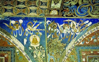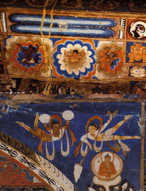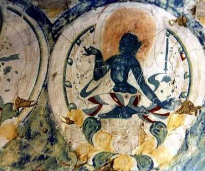 飞天,也称为“犍达婆”,在佛国世界里是 一种能飞行于空中的供奉菩萨,其职司是在佛说法时于空中散花,能奏乐,善飞舞,并且满身香气四溢,故又被称之为“香音之神”。在东嘎石窟中,飞天主要绘制 在曼荼罗上方的两侧以及佛龛中佛像的两旁。她们头戴花冠,上身或袒露,或着紧身短袖衣,双手持乐器或供器,有的头顶上遮盖有华盖,飞行的姿式都是上体仰 起,但双脚的姿式却各有不同:有的一足伸直,一足从膝部以下向后弯曲;有的则两足均向后翘起,膝部微曲,身上的天衣、帛带随风飘飞,整个身体在空中翩翩起 舞。如东嘎2号窟后壁佛龛内佛像上方所绘的一级飞天,双腿与身躯的变化十分丰富多彩,再配合以天衣、帛带的上下飘飞,便产生出不同的飞行于空中的动态,充 分显示出飞天千姿百态的风貌。