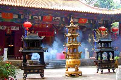 涌金寺,俗称大顶寺,是秀山位置最高的古建筑,因山势如“地涌金莲”而得名。面积六千余平方米。;宋代嘉熙 间(1237~1240年)在青山寺旧址建,重修于元明时期。明清时滇中南的佛教皈依者多云集于此,涌金寺宗风大振,被称为 “滇中大刹”。1979年以来,政府几次拨款修葺,新增建绕院长廊、小赢洲和瓷像馆等景点,更显壮观。