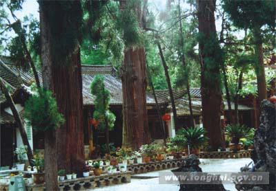 2、元杉位于涌金寺院中共两棵,呈左右对称,高40米许,树身围三人合抱,树为香杉科、四季常青。