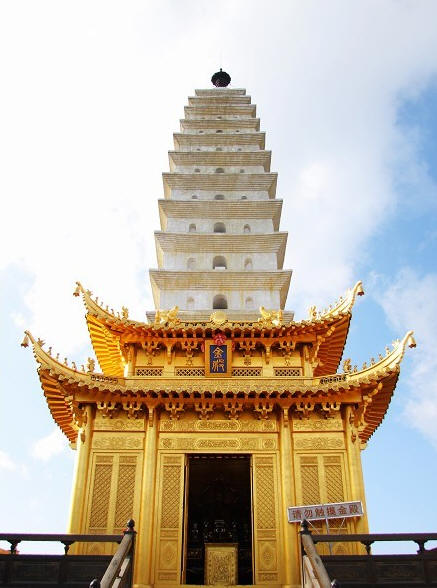 我们如今看到的楞严塔,是1929年云南省政府主席龙云上山应僧人请求而出资修建的。这座塔1932年动工,1934年建成,历时3年,支出经费合当时滇币100万元。塔高42米,方形密檐式 ,内有七级,外有十三层,巍然屹立于天柱峰顶,抗日战争时期,成为外援物资飞越驼峰的 天 然航标。沿塔内53级螺旋木梯盘旋而上,可在二层塔心楼观赏到释迦牟尼佛卧像。二层塔心楼四周设有铁栏,可饱览远山近壑、朝霞夕晖。