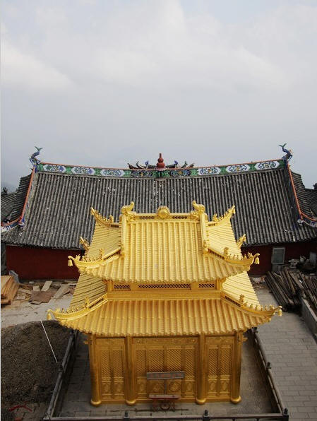 明铸金殿,在"文革"期间被毁。除了楞严塔外,金顶寺保存较为完好的还有"大门"。这道大门是由白族艺人设计的,充分体现了白族精湛的建筑工艺水平。门顶横列正脊,两端垂 脊,飞檐翘角,凌空欲飞,形式美观、大方。进入大门,弥勒殿前供奉弥勒佛像,殿后塑韦陀菩萨像。楞严塔后的大雄宝殿里,供奉着释迦牟尼佛像,佛像两侧,分别塑有阿难尊者、 迦叶尊者、达摩祖师、六臂护法王像。
