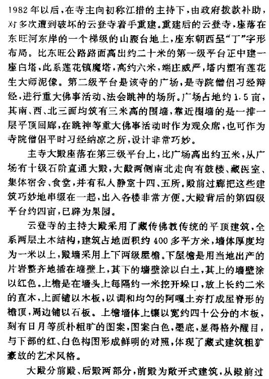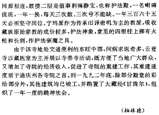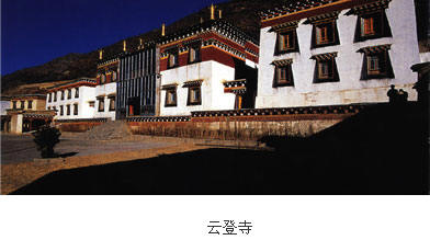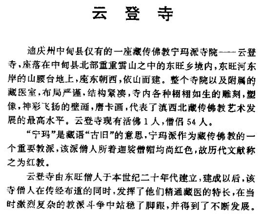 云登寺 位于中甸县城(香格里拉县)以东194公里处的东旺乡境内。建于1948年,是藏传佛教宁玛派寺庙,宁玛派俗称“红教”,因该教僧侣着红色袈裟、僧群、僧帽,故名。自五世达赖后,凡藏区重大事件都要请宁玛派僧人来参加仪典念咒作法。云登寺现有僧侣40多人。寺内建有藏医门诊,为当地藏民和慕名前来的就医者开诊。