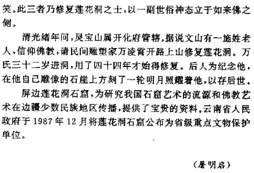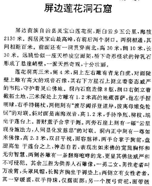 莲花洞石窟位于屏边县城南70公里的灵宝山上,海拔2100米。这里峰峦迭翠,森林茂密。莲花洞石窟有前后两个洞口,前洞已废,后洞高3米,宽4米,深15米,洞内雕刻造像8躯。在洞底岩壁上依壁雕刻有如来菩萨一躯,身高23米。洞口对面的岩壁上刻有玉皇大帝、瑶池金母,壁前有护法像韦陀,技艺纯熟,刻工细腻。洞内佛像和金刚像为明末清初作品。道教造像为清光绪二十年至三十二年(1894-1906年)所刻。1987年公布为云南省文物保护单位。