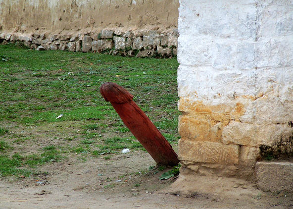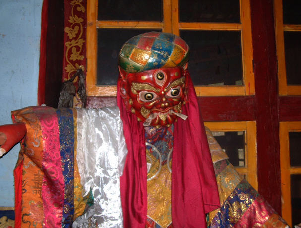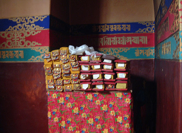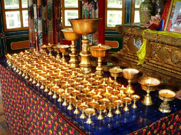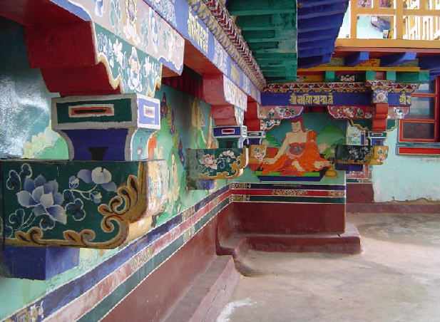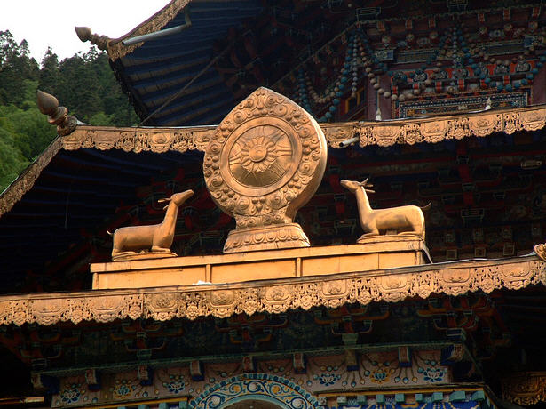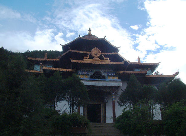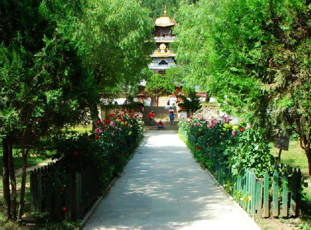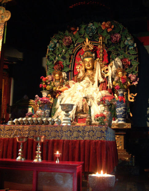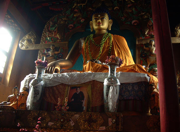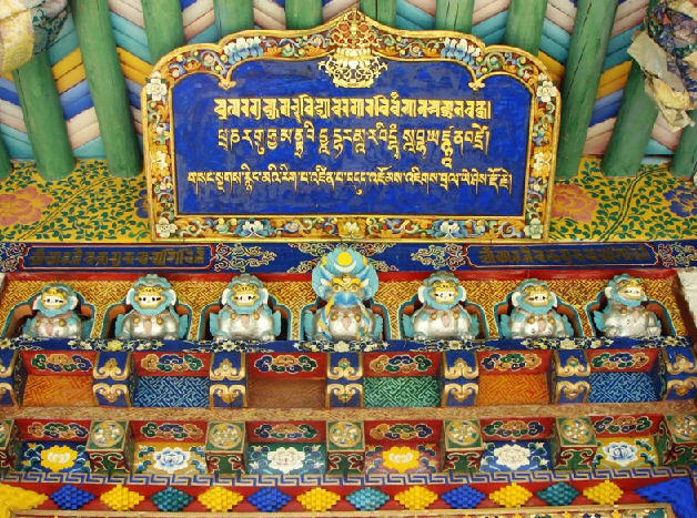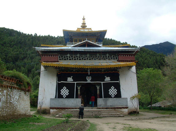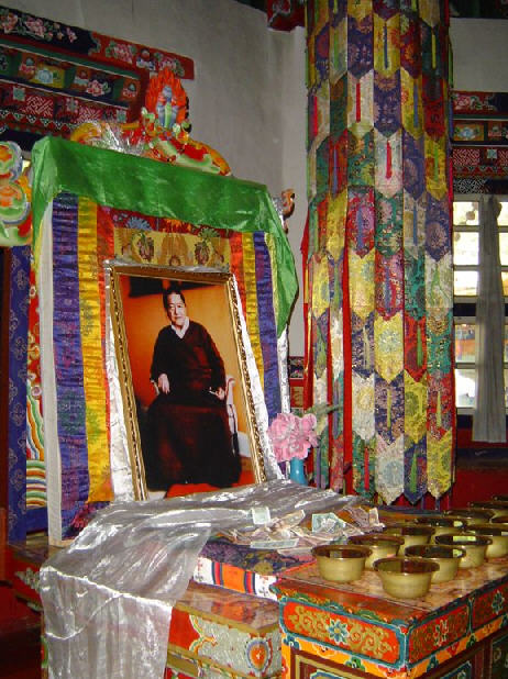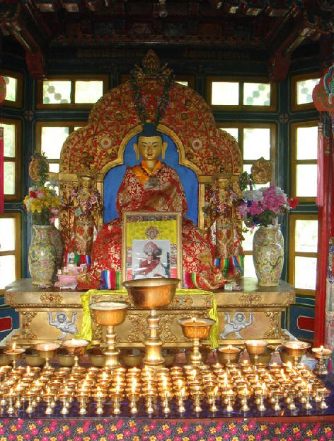 这座寺院在文革期间遭到破坏,于1984年在某位活佛级人物的募捐下重新修建,因此这里的一切看起来还是很新的。喇嘛岭寺正殿是正四角形,最底层屋 檐二十角,第二到第三层屋檐八角,佛殿高20多米,殿内正中供奉着一尊以五彩宝石镶嵌的贴金佛象,供桌上还“享祭”着重建此寺的那位活佛的大幅照片。正殿 两层,塔形金顶金壁辉煌,四面墙体涂成红白蓝绿四色,远观犹如一颗镶嵌在青山绿水中的宝石。