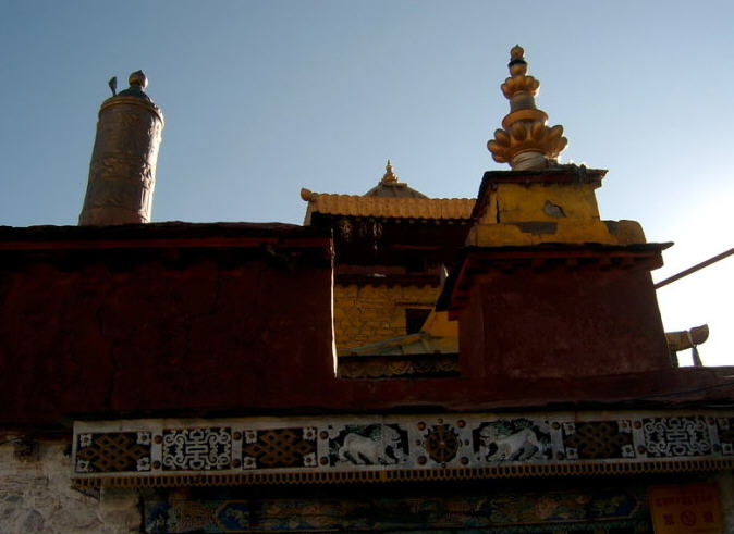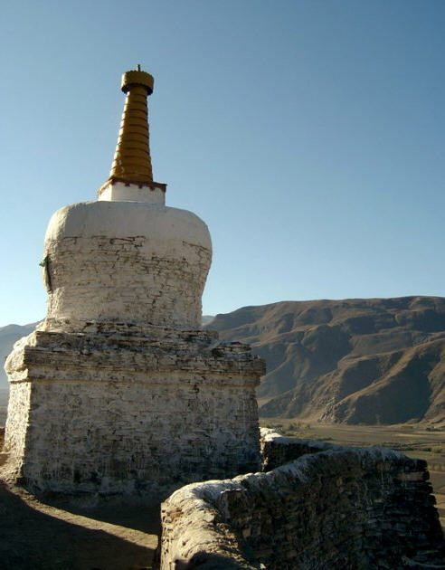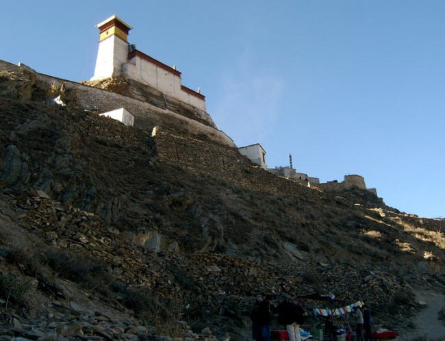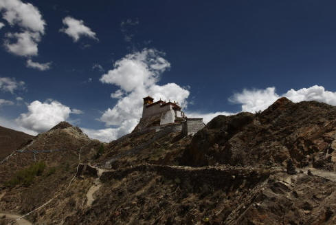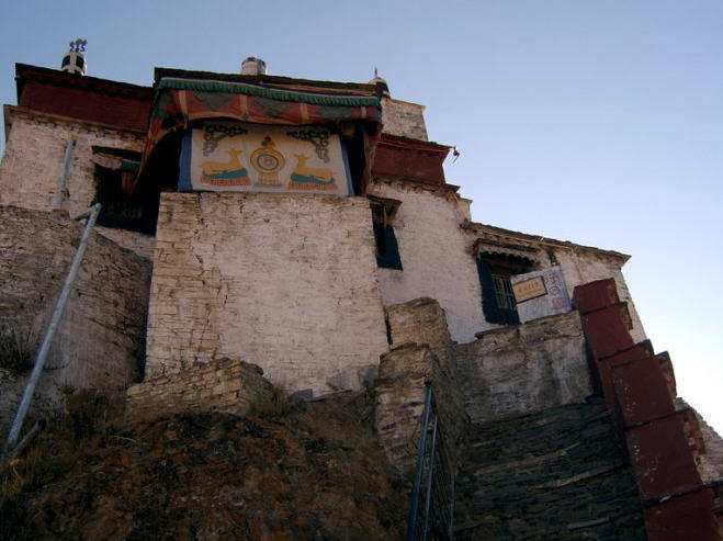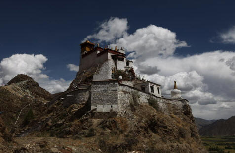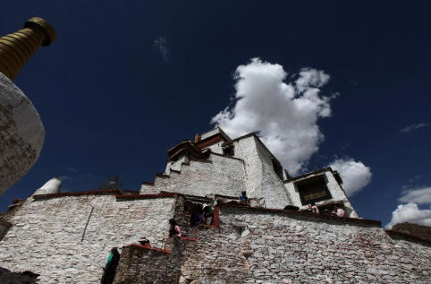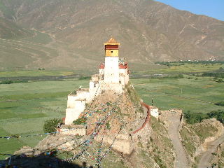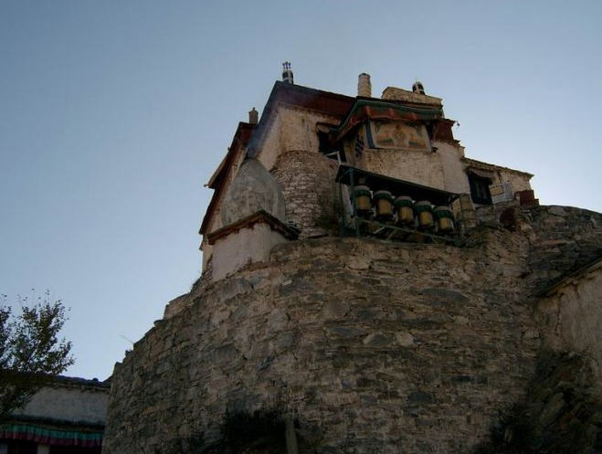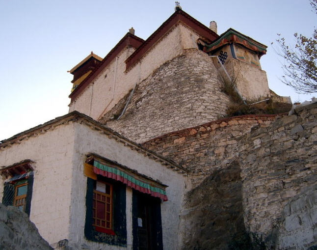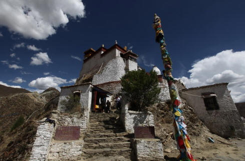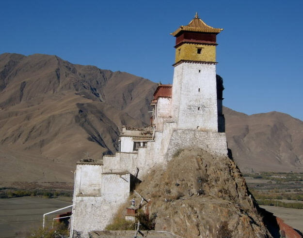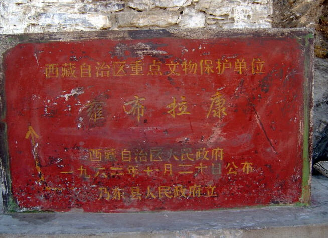 雍布拉康又译作“雍布拉冈”、“雍莫拉卡”、“雍布寺”等,建於西藏山南地区乃东系东南、邪隆河东岸的小山上:从昌珠寺往南行约5公里许,便可 见这座邪隆河谷第一代赞普——聂赤赞普的王宫,也是西藏历史上第一座宫殿。雍布拉康,藏文译为“母子宫”,或“母鹿后腿似的宫堡”,据传该寺建於公元前一 世纪,松赞干布时在原来的基础上又修建了两层楼高的殿堂。据藏史载,当年文公主入藏时曾在此稍住,作为夏宫,冬宫则迁昌珠寺。此后,雍布拉康由宫殿逐渐成 了寺院,历代都曾有不同规模的护建。例如五世达赖喇嘛打阿王.罗桑嘉措,在雕楼式建筑上加盖了金顶。15世纪后,宗额巴的弟子克珠顿珠在雍布拉康北创建了 日鸟曲林,并由该寺管理雍布拉康的事务。文化大革命时,雍布拉康彻底被毁,仅存残垣断壁。1982年,当地政府拔专款对雍布拉康进行修复,使这座藏历史上 著名的宫殿式寺院得恢复。雍拉布康的总体建筑分前后二部,前部为一座三楼房,后部一座雕堡形高层建筑,与前楼相连,均以石块砌成,全寺巍峨挺拔,气势宏 伟。前排呈长方形,进门有一宽三间、 深三间的门厅,再进为佛堂。佛堂的后面有三世佛,北壁为聂赤赞普、拉托托日年赞、松赞干布、赤松德赞热巴巾等历代 赞普的塑像。南壁为文成公主、尺尊公主的坐像。另塑有吐蕃时代著名大臣禄东赞和藏文创始人吞米.桑布扎的立像。旁边还有文殊菩萨、无量寿佛、自度母、尊腾 佛等像。二楼后面的殿堂里有下佛柜,内供弥勒、宗喀巴、莲花生、文殊等大小铜佛像;二楼左壁供了《甘珠尔》、《丹珠尔》等经书。殿内前方是四大护法神像。 这座宫殿还保存过“班公恰加钦波”经书孟加拉大博士罗森巴及其翩译利为带来的檀香木、玛尼经等文物。