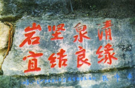 1994年6月23日,全国人大副委员长钱伟长夫妇重游岩泉寺,题辞"岩坚泉清,宜结良缘",已镌诸崖际。