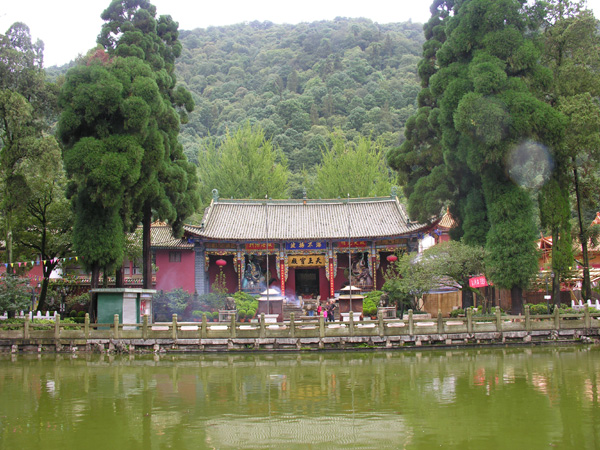 大雄宝殿之前,有一椭圆形水池,一石雕龙头伸人池中,口吐清泉,汩汩长流。相传元代建寺之时,云南昆明西山华亭山上,泉声垮垮,若鸣佩环,循声而去,得一龙洞,泉水长流,清洌明澈,遂以石槽连缀,渡人寺中。每逢春天花发,花瓣浮槽,可见落花流水之奇。今为饮水清洁,改用水管引水,唯泉水甘美依旧。汲水沏茶,尤为上品。近来崇尚自然之风大兴,左近居民。常有进山背水自饮者,成群结队,络绎不绝,一路歌笑,“泉通幽涧茶烟湿,云护深林鹤梦清”(清·池生春<重游华亭寺>),蔚为华亭山新景。