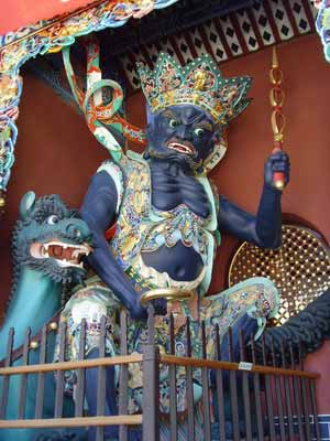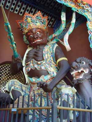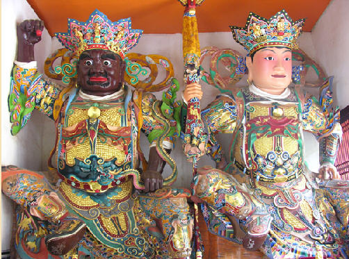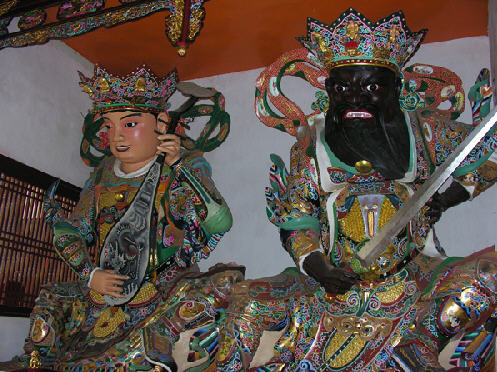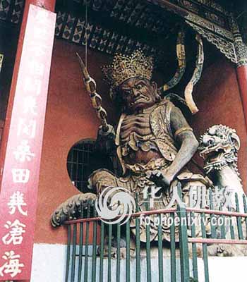 天王宝殿两侧,古柏参天,左蹲石狮,右伏石像,以青狮献瑞,白像呈祥,高大威严,显示佛法尊贵。这一狮一像,原为玉案山法界寺遗物,法界寺毁后移此。殿中有哼哈二将,有四大金刚,有韦陀将军,自不必说。天王宝殿门口,还有一联。为明代著名学者杨慎所题: