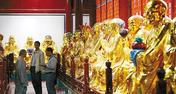 云南昆明西山华亭寺大雄宝殿为西山最大的殿宇,殿内自然少不了三世佛塑像,左右两壁,则塑有五百罗汉,千姿百态,各逞异彩,喜怒哀乐,意趣横生。大殿前数联,佛教色彩颇浓,如: