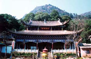 院中花木扶疏,庵后有百年树龄的九心十八瓣古茶花一株。游人登临金顶,或上或下多在此小憩。