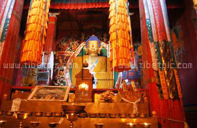 主殿:门 朝东,平面略呈方形,面积480平方米(长24米,宽20米),有八棱方柱22根(原为36根)进深7间面阔7间;在柱、梁及椽头上皆雕刻有如意云头、莲 瓣、卷草纹等装饰图案,在木构件上雕刻有鸟、狮、鹿等动物图案。殿内南壁原置有木端刻的千佛像;西壁北端置有创寺人拉喇嘛·强曲沃及寺中堪布芒布·卡敦活 佛的肉身,据说在清乾隆年间廓尔喀入侵攻入寺庙时遭到毁坏;西壁南端还置有寺主的宝座及释迦牟尼、班丹拉姆等镀金神佛像数尊;壁上置有木经橱,珍藏有《甘 珠尔》、《丹珠尔》各一套。殿内四壁原皆遍布壁画,其中东壁南端:左起为该寺护法神札西贡布,身黑色,面三目,左手执旗,右手执钩索,骑白蹄黑马,腰挂箭 袋、大刀,其下方为狗、狼等;中部为三世佛像,主佛结跏趺坐于莲台,内著僧祗支,外披黄色袈裟,其间绘有众弟子小像,或乘羊车或顶华盖执胜幢,姿态各异; 主佛两侧绘有头戴莲花宝冠的侍女侧身奉侍,其右侧绘有宁玛派祖师,头戴红色类帽,披黄色袈裟,坐于红色法台,其下为释迦牟尼弟子3人及3个头戴宝冠、佩大 耳环的伎乐天,下方绘有四臂观音像;最后端绘主尊马头明王,鹰身马首,其下为弟子礼佛、侍女仪仗图等,底边饰有莲花、祥云、法轮、金刚杵等图案。东壁北 端:左起为轮回图、二十一尊度母像;最右侧为护法神班达墨松加母,蓝身三目,右手执戟,左手执人天灵盖,身骑黄骡,其四周为众小神像:前有诸龙及六臂依怙 贡布恰县,后有猛狮及吹人骨法号、手执法仗的小神、上有宝马、骆驼、鹰、羊、狗、狼等动物相伴。西壁:主像为日松贡布像:释迦牟尼佛居中、强巴佛居左、桑 杰吾松松居右;其上方左起绘有米拉日巴、圣山冈仁波且、宗喀巴、次巴麦、嘎曲卓玛等像,下方绘有桑杰吾松的两名弟子和卓玛色布(黄度母)等像。南、北壁还 绘有本尊、菩萨、度母及历代达赖肖像等。主殿第二层有房间15间,其中5间为扎巴住所,其余为“聂章”(仓库);第三层有房18间,其中7间为寺主卧室, 其余为僧舍。现上层建筑已坍2毁,仅残垣上留有小窗。