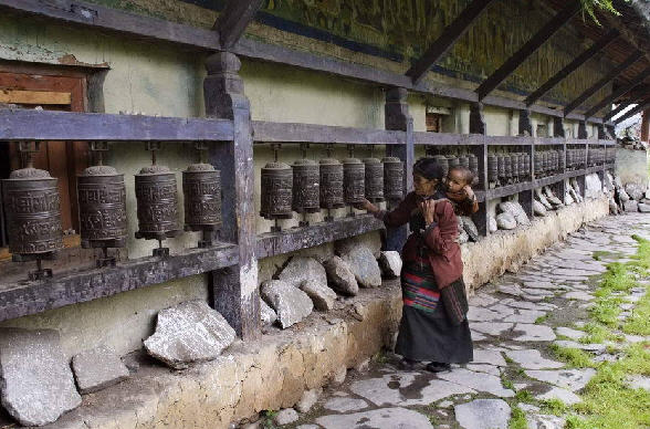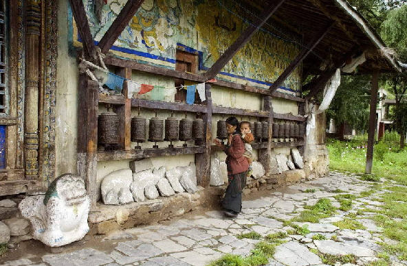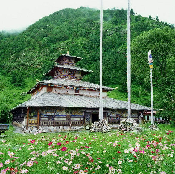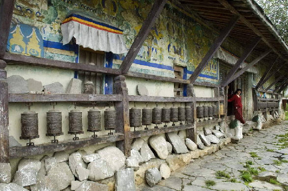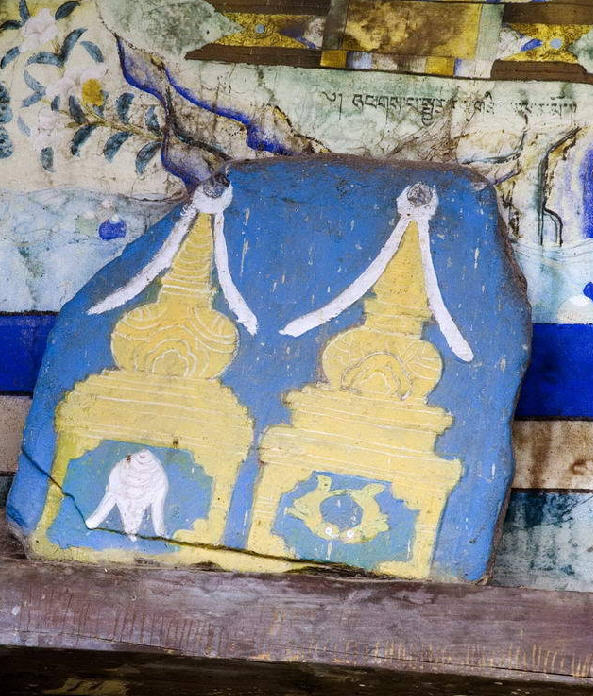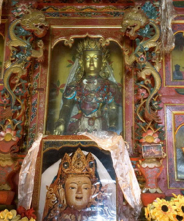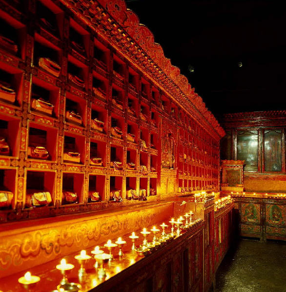 壁画 寺内壁画有早、晚期作品,分布在门廊、佛殿及外环廊。①门廊壁画。北壁右侧绘莲花生像,下方为其 弟子像,上方分别绘制密宗双身欢喜菩萨及白度母,以山水、云朵为底饰图案;左侧绘十一面观音,身披天衣、条帛,有光头及背光环绕,在其上方左右分别绘有释 迦牟尼坐像,下方左右绘制供佛仙女,中央为神山冈仁波齐峰。东壁现存部分壁画为释迦牟尼小像,均结跏趺坐于莲花之上,作各种印相,皆有背光。南壁自东至西 分别绘有三世佛、罗汉图、护法神、观音、度母像等。西壁绘有三尊护法神像。②佛殿壁画。南壁东段壁画上方为释迦牟尼像,中心绘宗喀巴师徒3尊,下方为5尊 并列的护法金刚像;西段壁画中心部位为观音法像,四周以雪山、云彩装饰,上方绘绿度母,下方绘曲班拉姆,西端为神山冈仁波齐峰,东端绘三尊护法神像。其西 壁与东壁原绘制有壁画,现已毁。③外环廊壁画。四面满绘壁画。南壁正上方门楣处绘释迦牟尼像,左右分别绘有度母、护法神像。西段为西方广目天王与东方持国 天王,两天王之间绘有坛城,中央为无量光佛,西侧绘有化佛小像。东段绘制南方增长天王与北方多闻天王以及供佛仙女像;西壁从南至北绘有护法神、十六罗汉、 历代高僧大德像等;北壁从西至东绘有释迦牟尼、供佛仙女和藏传佛教各教派的高僧大德像,如米拉日巴、噶玛巴法王、德敦嘎旺多杰、哈蒙居马、仁尊次旺罗布、 切洛桑扎、莲花生及妃子康祖•益西措杰和拉坚门德拉娃、赤松德赞、药师佛及其弟子、喜金刚、观世音菩萨、强巴佛、白伞盖佛母、多吉申巴、恰那多杰、绿度 母、宗喀巴师徒三尊、拉罗娃、吉尊强准等各种人物肖像。东壁下层壁画属早期壁画,大部分为上层画所覆盖,仍可辨识出菩萨像、赤松德赞像、法师像三个局部图 案。南段上层壁画年代晚于下层,题材内容包括释迦牟尼传记、松赞干布时代宫廷生活、削发剃度等不同的场面。其中《宫廷生活图》反映松赞干布时代的宫廷生活 情景。北段上层壁画的年代较晚,与下层壁画叠压。从北端开始,绘有布达拉宫、甘丹寺、哲蚌寺、色拉寺、琉璃桥、扎谷嘎林三塔及药王山等建筑群,长9米多, 绘有官员谒见布达拉宫的场面。