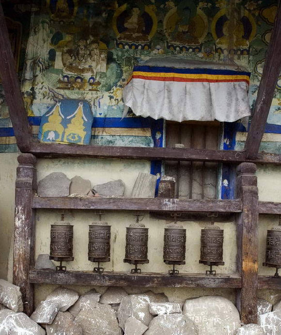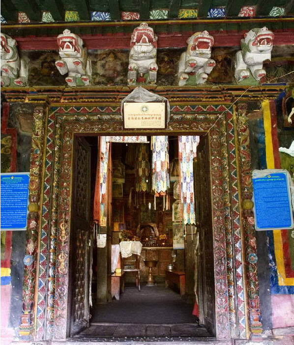 门廊壁画:门廊北壁右侧为莲花生像,其下方绘其弟子,上方分别绘制密宗双身佛像“定觉”及白度母,间饰山水、云 朵图案;北壁左侧绘十一面八臂观音,足踏莲座,身披天衣,搭条帛,有头光、身光,其上方左右分别绘释迦牟尼佛坐像,下方左右绘一般说来丹拉姆(吉祥天女) 护法神,中央为“圣山”冈仁波且。门廊东壁为释迦化佛小像,皆结跏趺坐于莲台上,结各种印像,皆结跏趺坐于莲台上,结种种印相,皆有背光。门廊南壁从东至 西分别绘有化佛、三世佛、罗汉、护法神、观音、度母像等。门廊西壁绘有3尊呈忿怒状的护法神像。