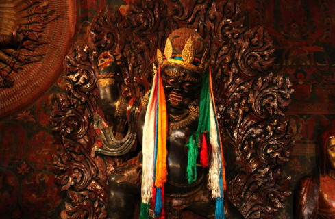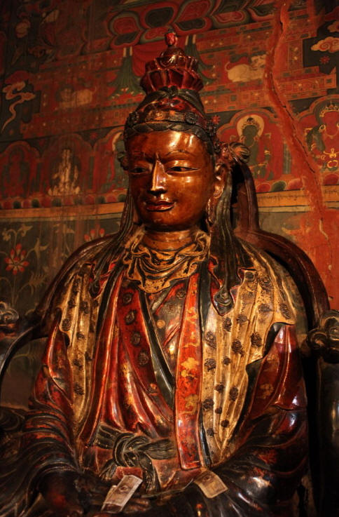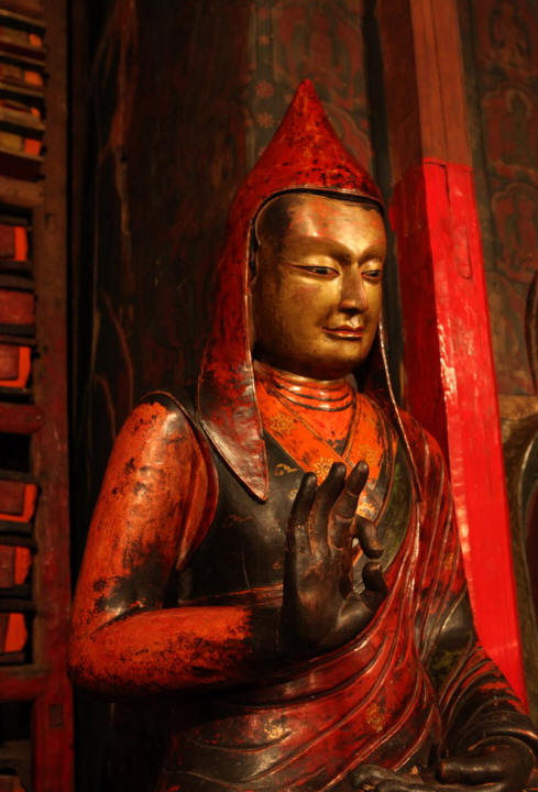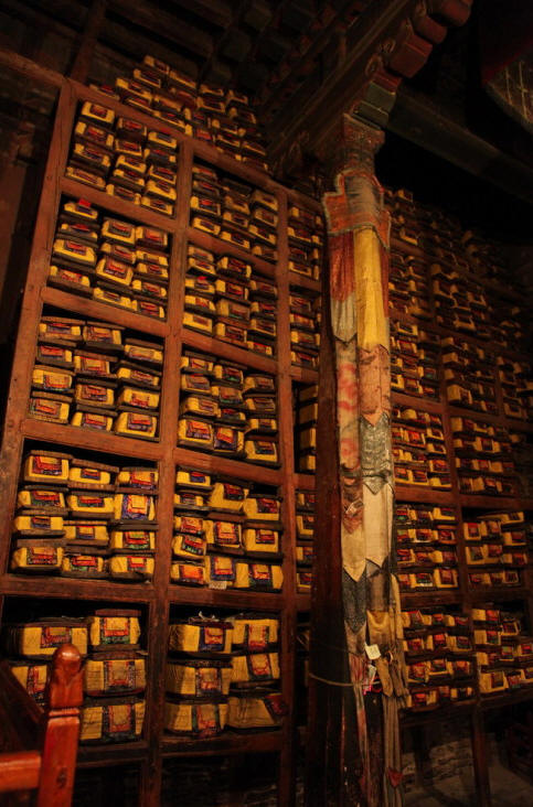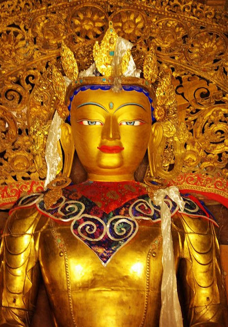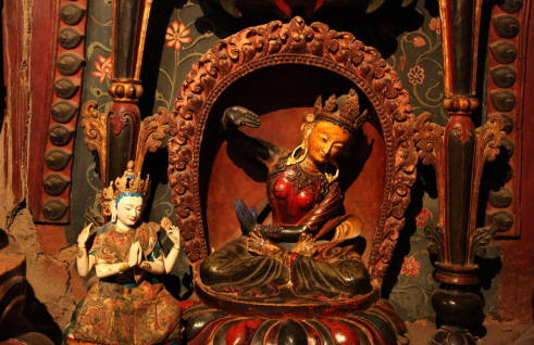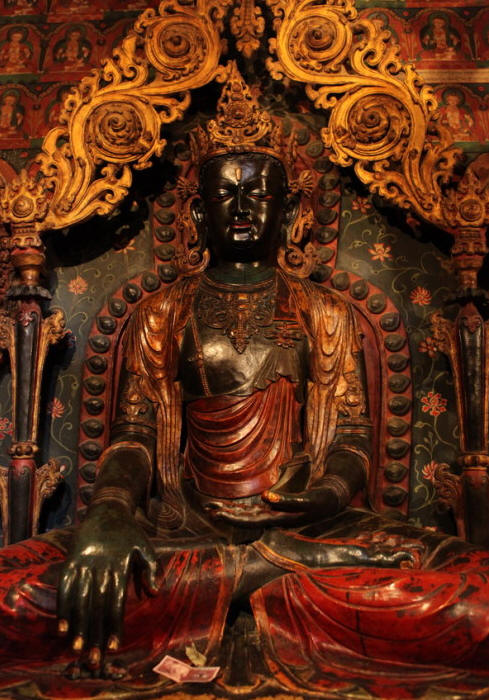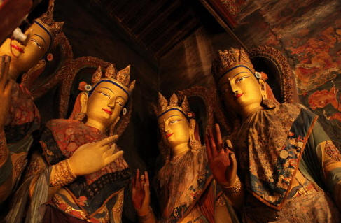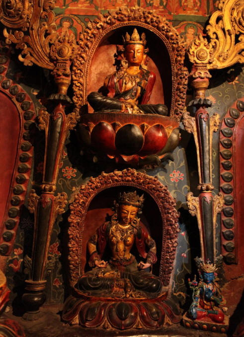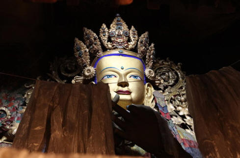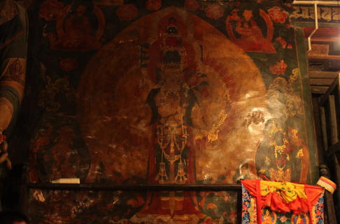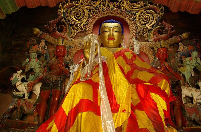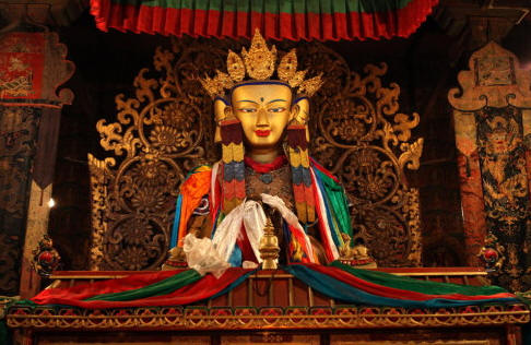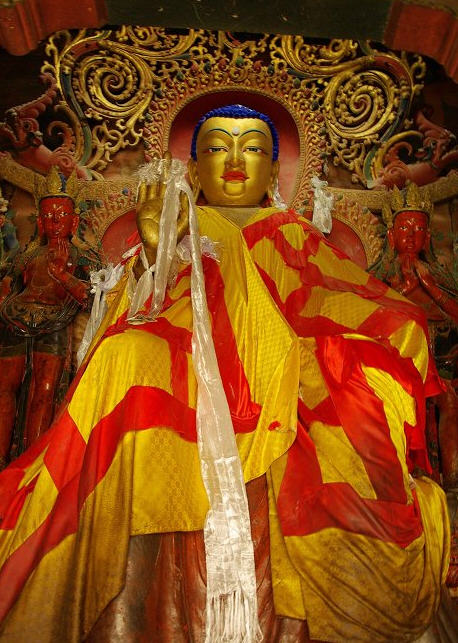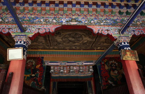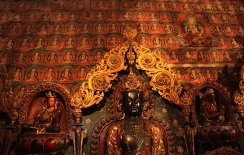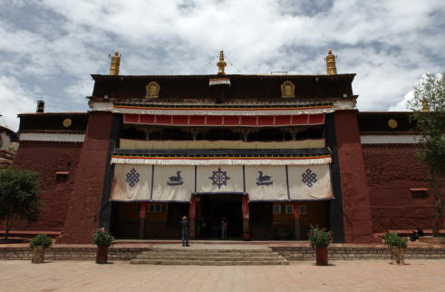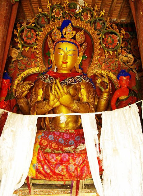 该地 主体建筑为措钦大殿,共3层。大殿坐北朝南,呈十字形,底层为佛堂,有柱48根。北左壁的强巴佛铜像,有二层楼高。经堂北面的觉康正殿,宽5间,深3间, 供奉有三世佛大铜像,两侧塑有十六罗汉,造像浑厚、荘重。经堂两侧为东西净土殿。东东净土殿中间龛供奉强巴佛像,像后东壁塑有千手千眼十一面大悲观音,造 像高大荘严。西净土殿,殿中龛室供奉卢膨那佛像,四壁布列菩萨和供养天雕塑。两殿四周有壁书,人物婀娜多姿,形象逼真。