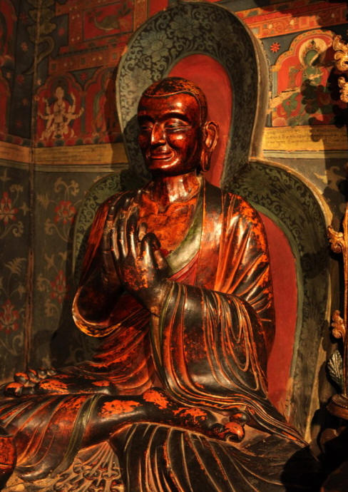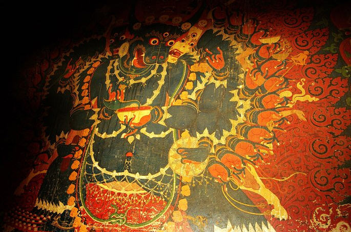 大殿二层有闰基大殿,用於集会。登觉殿内有一座直径3米许的立体时轮坛城。二层殿内有名闻雪域的明代艺术珍品十六罗汉。大殿北有3层殿堂夏那拉康,其四壁绘有55个坛城。殿堂顶棚天花,由六角形图案形成。图案中书有莲花和六字真言,为西藏寺庙中少见的珍品。