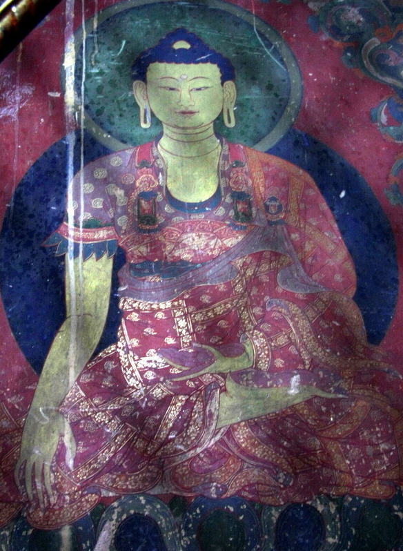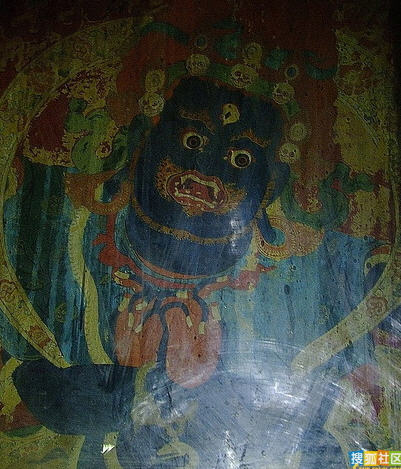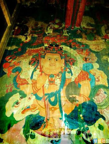 大经堂下正中的佛殿内供释迦牟尼佛,左边为强巴佛殿,塑 像都很高大。佛殿门前的左右墙上绘有约2米左右的萨迦五祖的壁书,生动地突出了萨迦派寺院的特点。大经堂正中佛殿的背后是一凹形的转经迥廊,迥廊两墙都绘 满了大型佛经故事,绘书的年代约在清代以前,但由於迥廊内阴暗潮湿,大部分壁书开始剥落毁坏,急需加以修复和补救。佛殿的前方为长方形的天窗,用以采光。 其天窗的内壁上绘有萨迦五祖,格鲁派宗喀巴师徒,甚至带有明显汉地书风的大肚弥勒佛等绘书作品。其造型生动,色彩鲜艳,生动地表现出格鲁教派支该寺的壁书 影响。