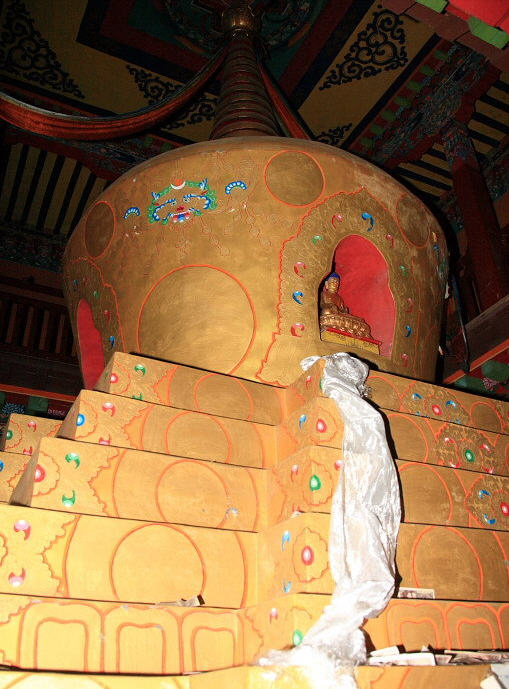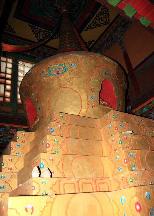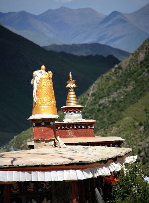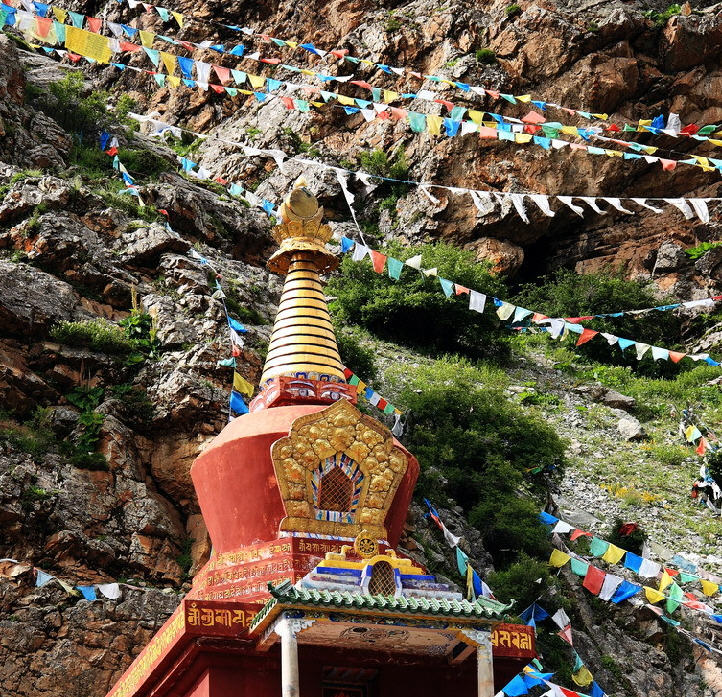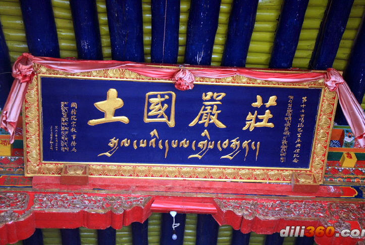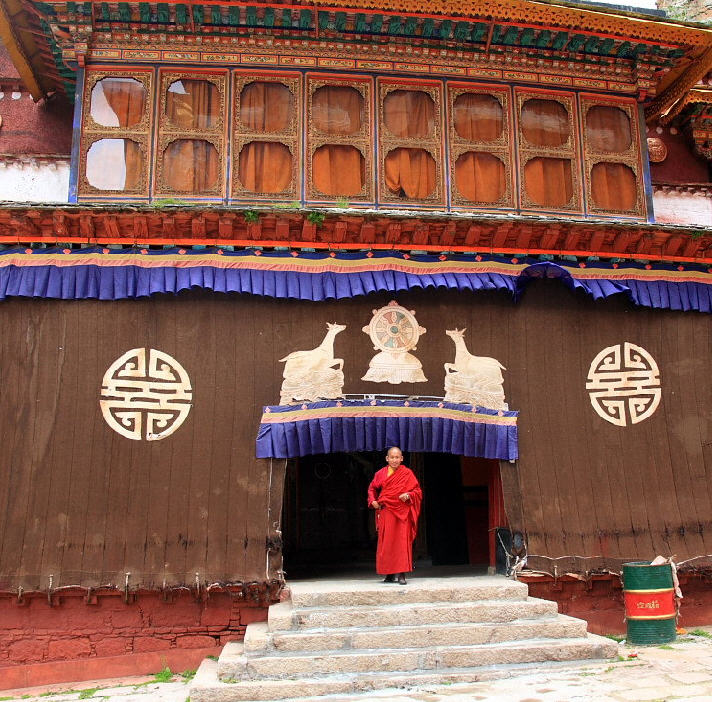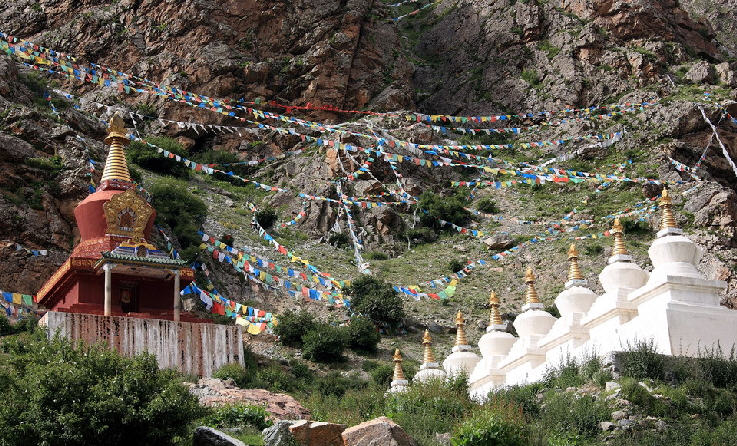 楚布寺海拔4300米,坐北朝南,南西北三面环山,以五层楼高的“绛白央”大殿(文殊殿)为中心,背山面水,河南岸高山北麓筑有一座高大的晒佛台,主殿四周环绕着四个扎仓,并以经堂、神殿、僧舍及喇让、静室等建筑群组成一座雄伟壮观的古老佛刹。