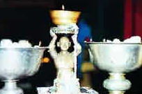 桑耶寺金银酥油灯。供奉于桑耶寺佛堂前的这3盏金银酥油灯约有1200年的历史,为建寺初期制造。中间为铜座金灯,两侧为银灯。