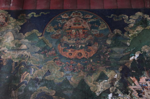 从东面的哈布日山上俯瞰桑耶寺,宛如佛经中的记载,世界本为空寂无垠之体, 由十方风起互相激荡而成为风轮,其上聚水而成为大海,海面有金色地基,之上矗立着由各种宝物构成的须弥山。沿此山依次而上,分别为欲界、色界、无色界。须 弥山之东,是形如半月的身胜洲;其南,为肩胛状的瞻部洲;西为圆形的牛货洲;北为方形的俱庐洲。这一美妙的宇宙形成图景,藉桑耶寺建筑的形式而呈现于世 间。