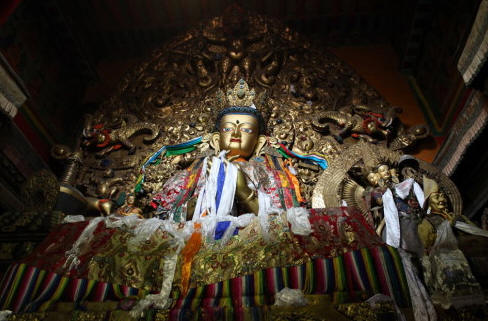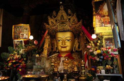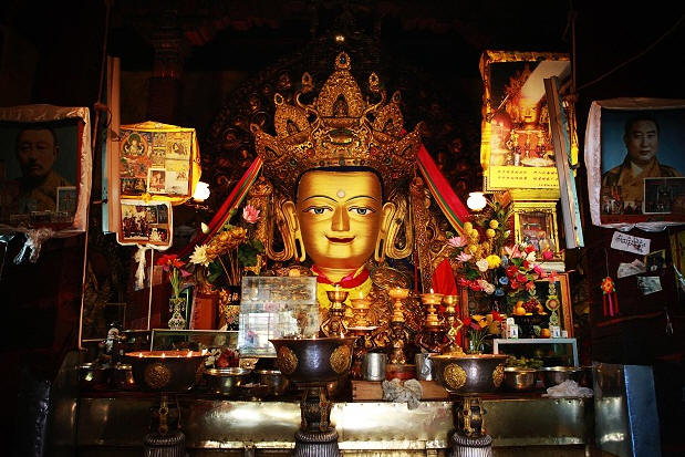 大殿三楼有一小殿叫“强巴通真拉康”。内供巨型的强巴通真铜像,据说这是强巴佛长到8岁时的身量像,系乃东王应宗喀巴吩咐而造的。塑像颇带几天 稚气。为佛造像中的佼佼者。佛像前供有一个法螺,据说是宗喀巴授命绛青曲结建哲蚌寺时赠送给他的法物。佛殿顶部的金顶特殊,为方形尖顶式。佛殿门上悬挂 “穆隆元善”汉文匾额一方。匾上刻有椭圆形篆字图章一枚,文为“大清道光丙午年孟秋之印”,后面亦刻图章两枚:一为“勿穆氏”3字;一为“琦善之印”4 字。这块匾额是时任驻藏大臣的琦善在他任满调离西藏的1846年(清道光二十六年)7月刻制奉献的。从一个侧面反映了清朝政府对藏传佛教的扶植利用政策。