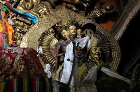 大殿四楼为释迦佛殿,主供释迦牟尼说法像,据说是这500两白银制成的。两旁置银塔13座。侧殿为罗汉堂内供佛教中的历代祖师和罗汉等神像,并供有哲蚌寺主要大活佛的报身像。佛殿顶部建有一金顶,为歇山式;金顶下有华丽的斗栱,系借鉴内地建筑营造法式。