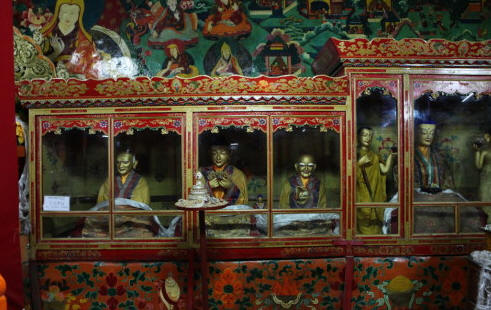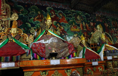 堆松拉康的左侧是“弥旺拉康”。其内塑一尊高大的12岁身量的强巴佛坐像,身在下层而头部达于二楼。该佛像由颇罗弥旺出资塑造,故其称为“弥旺 强巴”,佛像比例匀称,刻画细腻,形象亲切感人。堆松拉康的右侧是“伦崩拉康”。其内前边有两座较小的白塔为“伦布佛塔”;后部并列三座银塔:中心为第三 世达整风(索南嘉措)灵塔,高6.16米;北侧为第四世达赖(云丹嘉措)灵塔,高5.57米,加上1米高的木制束腰须弥座,通高达6.57米;南边为摄政 王灵塔,通高4.6米。灵塔制作精致豪华,皆以银皮包裹,又嵌以珠宝奇珍,仅第三、四世达赖灵塔就耗去白银14800两。