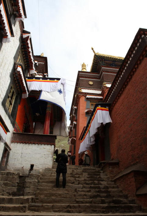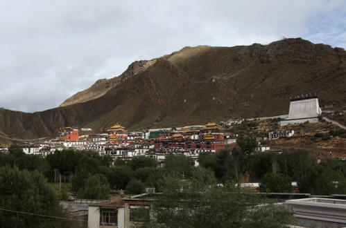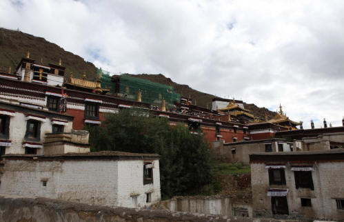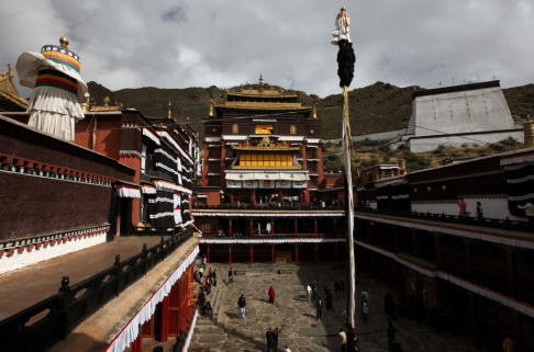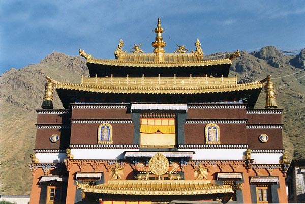 扎寺占地面积15万平方米,周围筑有宫墙,宫墙沿山势迤逦蜿蜒,周长 3000多米。寺内有经堂57间,房屋3600余间。整个寺院依山坡而筑,背附高山,座北向阳,殿宇依次递接,疏密均衡,和谐对称。金顶红墙的高大主建筑 群更为雄伟、浑厚、壮观。远处眺望,楼台醒目,殿堂叠耸,金碧辉煌,宏观而壮美。进寺观看,香炉紫烟升腾,供台灯火闪烁,众佛尊容各异,形态十分逼真。大 殿里,僧侣诵经井然;佛像前,信徒顶礼膜拜。500多年来它强烈地吸引着国内外佛教信徒、游人在这里朝拜、观瞻。