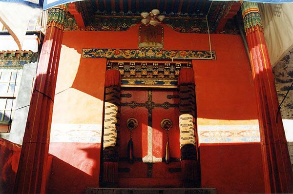 汉佛堂偏殿,有一清朝驻藏大臣与班禅的会晤堂。正殿,挂着清朝乾隆皇帝身着袈裟、手端法轮的大幅画像, 像下立有道光皇帝的牌位,上写有“道光皇帝万岁万岁万万岁”文字。每逢皇上下诏,班禅接旨受封后要在皇帝牌位前叩首谢恩。汉佛堂内的文物,不言而喻地证明 了西藏地方与历代中央朝廷的隶属关系。