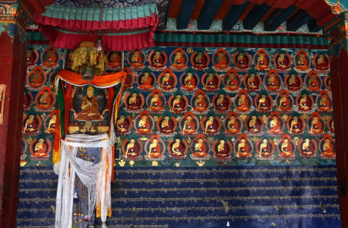 大经堂,即错钦大殿,是扎寺 最早的建筑,历时12年建成。大经堂前,有个600多平方米的讲经场,这个场地是班禅对全寺僧人讲经及僧人辩经的场所。讲经场四壁,有石凿而成穴居于洞壁 的佛教祖师、四大天王、十八罗汉和形态各异的1000尊佛像。北墙正中,绘有黄教祖师宗喀巴等尊者形象和80位佛教高僧及各种飞天仙女、菩萨。大经堂 内,48根朱漆大柱遥相挺立,承托殿顶,殿堂正中有班禅的宝座。大殿左侧,是公元1461年,在阿里古格王觉吾扎蚌资助下扩建的大佛堂,当中塑造了一尊高 11米的弥勒佛像,佛像面部形态慈善和蔼,端庄娴静,由尼泊尔工匠与藏族工匠共同完成。大殿堂右侧,是度母佛堂,里面安放着高2米的白度母铜像,两旁是泥 塑的绿度母像。经堂里面用喜马拉雅山麓的片岩铺成,整个环境弥漫着一种修行炼法的浓厚气氛。