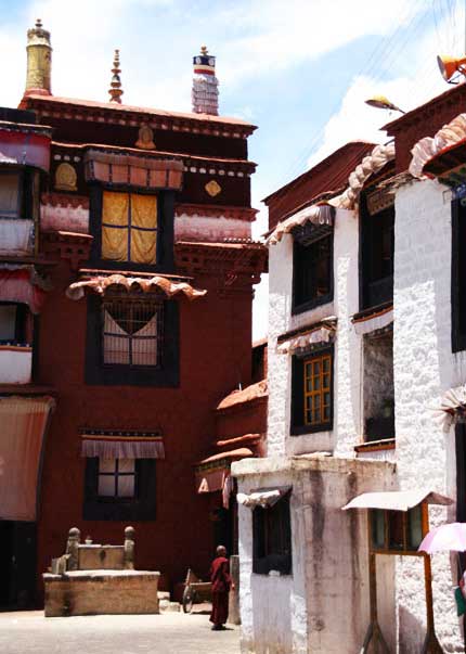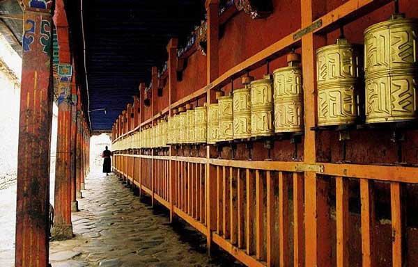 小昭寺,占地面积约4000平方米。其前部为庭院,后部是神殿及其门楼、转经回廓等附属设施。门楼高三层:底层为宽 敞的明廓。明廓有10根大柱(直径0.8米),皆为十六棱形。柱身有三条铜箍,铜箍面上透雕花瓣。柱一上半部雕有繁缛的花草纹,柱头上浮雕宝珠、“回”字 纹、花瓣及连续的“六字真言”。前四排大柱的柱栱上浮雕海水云龙纹。明廓后部墙壁上绘有四大金刚(即四大天王)和六道轮回图(画面上有一个棕色的凶恶明王 抱着一个巨大的车轮,巨齿獠牙衔着轮的上部;大轮分成三层,圆心画蛇、鸠、猪等,内轮分为六格,即六道,最外层又有十二个画面,称“十十缘起支”:即无 明、行、识、名色、六处、触、受、爱、取、有、生、老死)、极乐世界图等壁画;门楼二三层是僧房和经堂等。穿过门楼即是绕神殿一周的转经回廊。回廊南、 西、北三面原竖有木制嘛呢轮,廓壁上也遍绘无量寿佛、白度母等壁画。