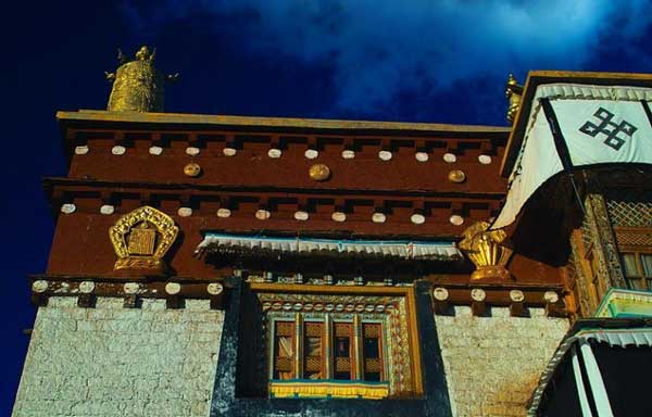 小昭寺神殿高三层:底层分为门庭、经堂、佛殿三部分。门庭内左右为隔门小房,右间是放吹器的地方;左间是配殿,内供 有石榴树枝做的贡布色懂马塑像。中间是四柱宽的空廓,传说原来其中一根柱上挂有文成公主手印的石板,另一根柱上挂有护法画皮两张。四柱皆为圆形大柱,大柱 小栱两侧各雕一大力士,力士作承托支撑状。柱头大栱上雕有狮子和圆形升云纹、花瓶等。有的柱头小栱两则浮雕象征性的狮子和人像。门上铺首如钹形,上有二龙 戏珠图案。横梁上皆写梵文六字真言。这些雕刻古朴端庄,体现了早期内格特征。门庭后面为经堂。经堂进深7间面阔3间,30柱,柱下皆有石柱础。其中中部4 根大柱直通二层之上撑起高敞天窗。柱高6.2米,直径0.46米;其余26根柱子高2.8米,直径0.48米。柱头皆为卷云纹、宝珠、莲花纹等雕饰。集会 堂天井正对的一排檩头上原雕有28只卧狮,现存27只,系全雕和半雕;腹腔上有底座,装饰四瓣或八瓣莲花。集会堂四壁曾遍绘释迦牟尼、千尊佛等。西后净室 门口南面供塑有舍利弗与目犍连两大弟子孙灵塔及高0.4米的铜鎏金密集金刚造像、泥塑的杰尊·贡嘎顿珠造像;北面供有高1米的吉祥金刚怖和能仁佛、藏巴拉 等佛像。净室门口两侧还供有四大天王泥塑像。最后部是佛殿,内2柱,无柱础,面积23.5平方米。大柱表面用麻绳缠绕之后又用2~3厘米的泥皮涂抹,可能 是防腐、防火的措施。柱头雕有莲花宝座,柱头小栱上则无装饰,具有明显的早期特点。四壁的壁画多为线描盘腿坐形象,笔法流畅生动。大殿的墙壁均用大石块夹 小石片砌成,厚1~1.3米。殿内供有尼泊尔墀尊公主带来的铜鎏金不动金刚佛和八大随佛弟子泥塑像,以及两大忿怒力士、宗喀巴塑像。佛殿后部和两侧还绕以 密闭回廓,偏窄、较高,具有早期布局特征。神殿第二层前前为僧舍,中部为大经堂天井,天井之后为供佛大殿,6柱,内供桑杰鲁王甲后、十六尊者及经书;里面 还有一大殿,8柱,内供药师八如来和《甘珠尔》佛典,北面供奉有救度母及其他佛像。神殿第三层前面为达赖喇嘛到该寺的专用住房,共6间。后部则为金顶殿, 殿门向东,面积约54.5平方米,内有明柱两排8根,左右开小窗。殿左右及后部有一周狭窄回廓,以木栏相围。金顶为汉式风格,属歇山式,以斗栱承托;金顶 垂脊末端套有羯摩鱼头,是为套兽。殿内门窗壁画、柱子等则是藏式风格,体现了藏汉建筑的巧妙结合。