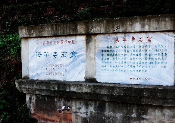 石窟位于安宁市城东5公里小桃花村的洛阳山上,因建有法华寺而得名,为宋大理国时期所雕刻的石窟群。石窟依山岩绝壁修建,共分4处,第一处,雕地藏菩萨及观音造像;第二处,雕十八罗汉,因遭毁坏,大多残缺,分列为上中下三层,窟下石壁刻有"晚照"二字;第三处,原有造像三窟,有一窟雕有佛及菩萨像,另二窟已无法辨认;第四处,雕释迦佛涅磐像,俗称卧佛,长4.8米,为石窟中最完整的一窟。