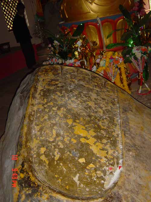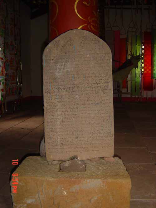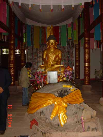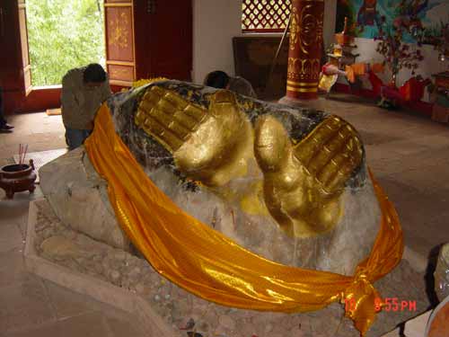 岁月已过数世纪,黑龙吃人害命的本性还未改正,反而变本加利,后来,各村寨的头人乡老研究压制龙王的对策。大家认为,唯一的办法只有依靠大佛的神威才能镇住黑龙作恶,于是决定在芒朵寨子边佛祖在大石头面留下的脚迹手印上建盖佛堂,在大殿堂内有:佛祖的塑像刷金涂银,亮光闪闪,佛祖一脚踏石的脚迹手印金亮显目,寺内有一块石碑记下了这段历史。