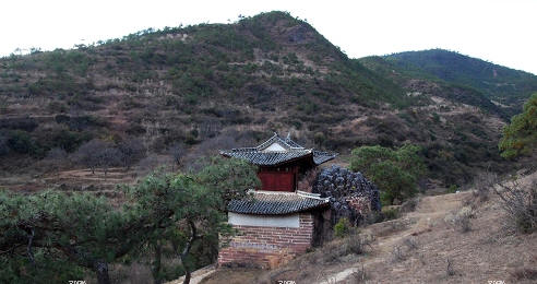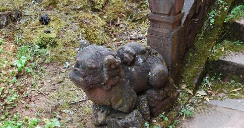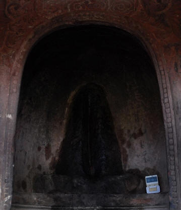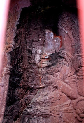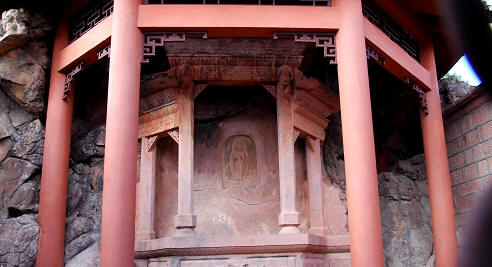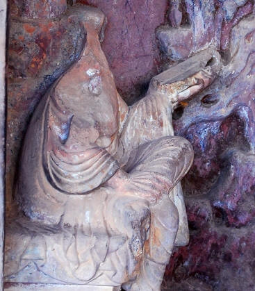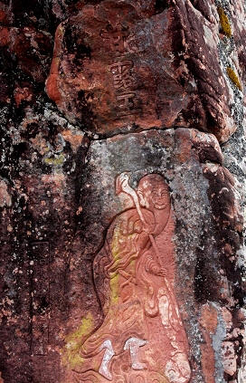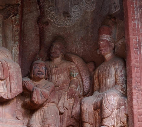 石钟寺一号窟,亦为王者像。唯场景、气氛与上窟不大相同。与第二窟相较,虽中心人物均为王者,构图也略呈半圆形,但有许多区别--二窟王者周围多是披坚执锐威风凛凛的骁将;此窟则多是忠实善良、知文习武的大臣,并有手持书卷的从者出现;二窟有曲柄伞、五方旗等依附吐蕃的标志,此窟则已不见,唯增王前的香案;从窟檐雕刻的简、从者持印、执藤杖、背斗笠等细节看,近人多推测他就是毅然归唐的异牟寻,左右二人是清平官郑回和杜光庭。史载,异牟寻曾从郑回学习汉文化,群臣多知中原礼仪;归唐后又派大批南诏子弟到中原学习。异牟寻在位时,注重发展生产,屡败吐蕃,为南诏极盛时期。