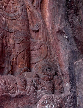狮子关第一窟,石钟寺第一、二窟,分别刻画了南诏三代王者的形象。南诏,这个对西南边疆有过重大影响的地方政权,始于细奴逻躬耕巍山,在唐王朝支持下,艰苦创业;阁逻凤联合吐蕃大破唐军于西洱河的时候,开始有了发展;盛于异牟寻重新归唐,广拓疆域。石窟的作者,精心选择了这三代帝王,对南诏的历史予以艺术的表现。