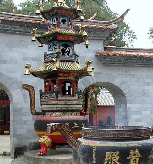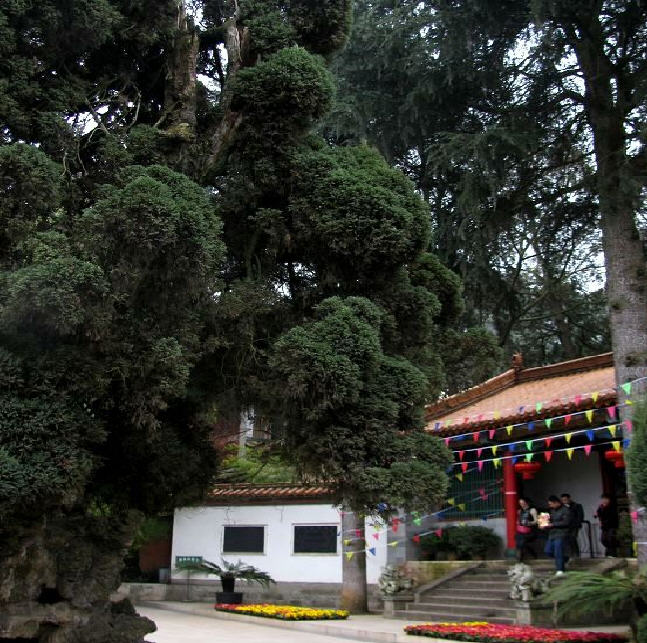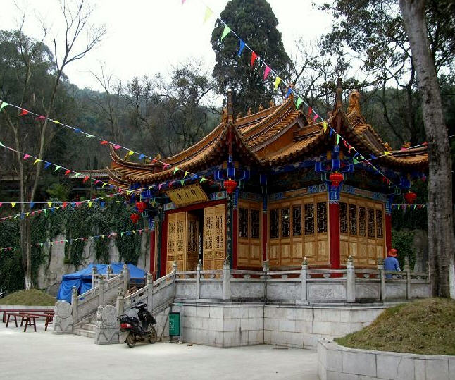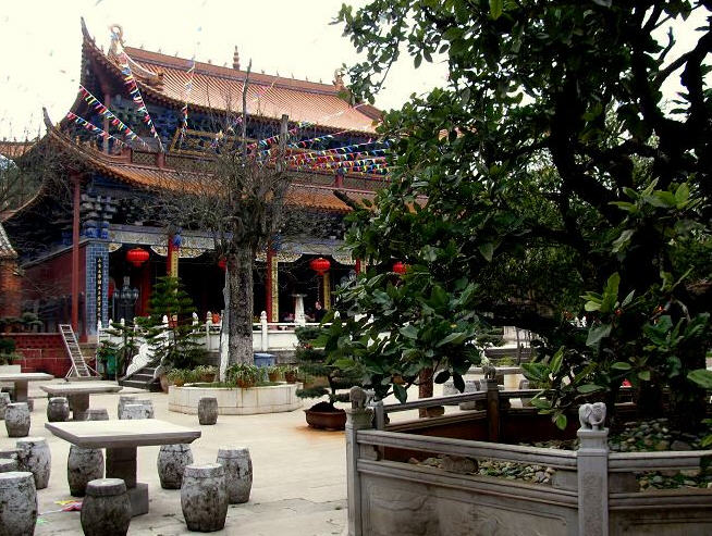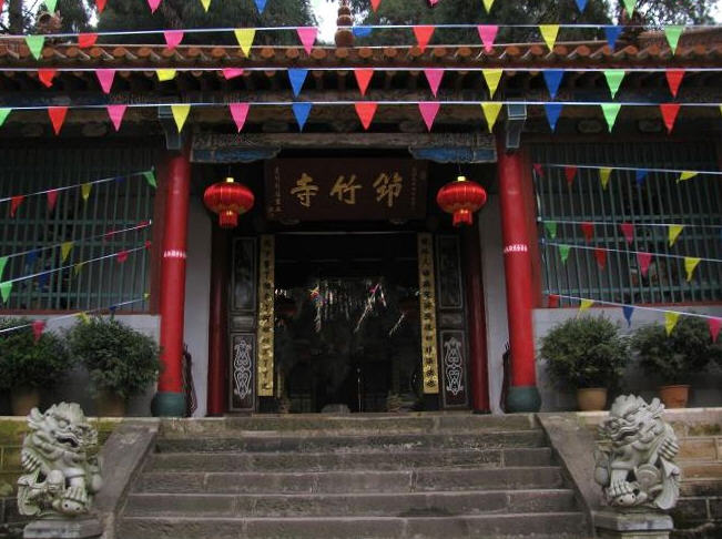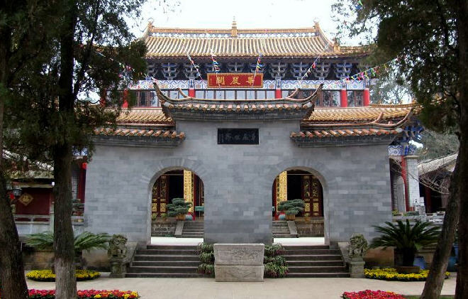 筇竹寺位于昆明西郊约 7 公里的玉案山上。这里林木繁茂、翠竹葱郁,将一个名声颇著的古刹雅寺深蔽于绿荫之间。据说,筇竹寺始建于元代,昆明佛教徒开始信奉佛教禅宗,宣讲大乘佛教就源于此。现在的筇竹寺是于清光绪年间( 1883 — 1890 年)重建的。这座古寺依山势而建,分为四层三院,精巧严谨,很有特点。