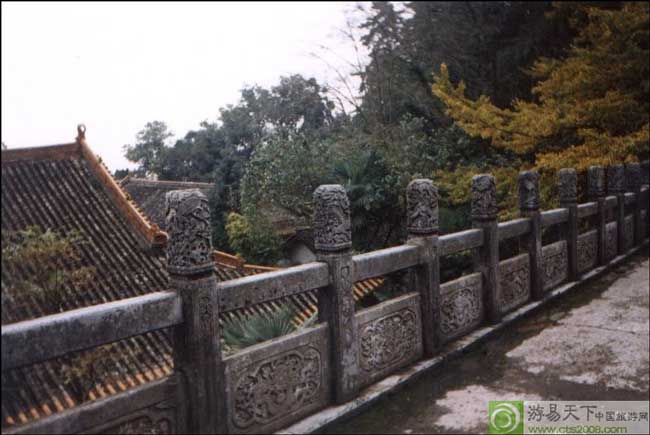 雄踞高台丛林之上的大悲阁,气象非凡,雕檐绘彩,台墀高大宽敞,能容光焕发纳上百人。引人注目的是大理石台墀栏杆上攀附着龙、狮、虎、象、孔雀、仙鹿等。它们体态逼真,神情各异,栩栩如生。这是在康熙年间从昆明城内吴三桂的王府里拆运来的。大理石浮雕栏杆透露出吴三桂曾几何时的豪富、奢华、贪酷和衰败。