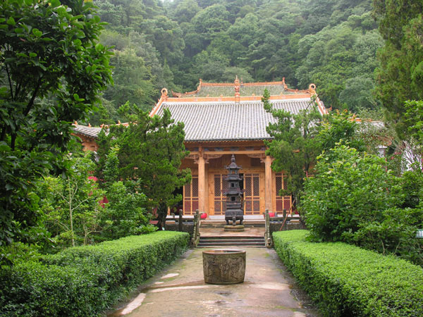天王殿单檐歇山顶,面阔三间,进深两间,殿高近二十米,占地367.5平方米。殿正中一座木雕观音,双手合十,神态慈祥,站立在莲花神龛上,高约两米,宽冠华服,璎珞蔽体,系清康熙年间遗物。仰望观音信容,不禁令人生起一股普渡众生之感。大殿两旁为粉彩四大天王塑像,各高三米,神情安然,不怒自威。背面韦陀披金甲,按剑踞地,展现了护法神的尊严,相传为光绪年间黎广修的作品,创作手法著重于精神状态和内心世界的刻划,形象逼真朴实,更接近现实生活中的人物。穿过庭院,进入大雄宝殿,面阔五间,进深四间,殿高近三十米,占地484平方米。殿堂由二十二根明柱支撑,屋顶方檩子骨架,穿逗结构,外廊四个石鼓支撑四根巨柱,雕梁画栋,富丽堂皇,始建于元大德十年(1306年)。大殿檐下悬挂“如如不动”横匾,是对释加牟尼的赞颂。大殿正中供三世佛,高三米,正中释伽牟尼;左右为药师师佛、阿弥陀佛;释伽两侧立迦叶、阿难两弟子。他们神情庄重,慈眉善目,金粉着身,造像出神入化,技术精湛,相传为元代作品。