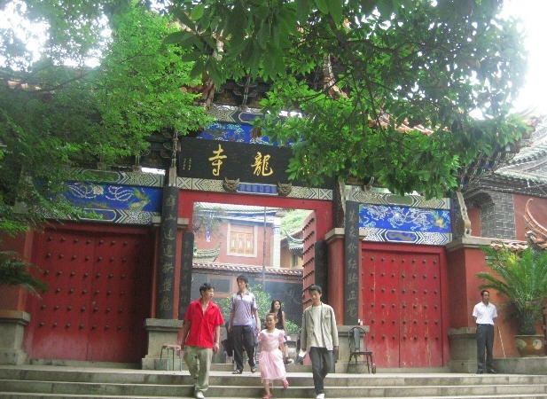 云南昆明盘龙山方圆数十里,主峰巍峨,群山环拱,龙盘迂回,松涛万顷,中峰突起,名称盘龙,寺因山得名。正是“蜿蜒山不断,作势欲盘龙。树杪藏箫寺,云根隐秀峰。”(清·周华林<盘龙山>)相传元代建寺之时,寺址为山间龙潭,有蛟龙深蛰,盘龙祖师莲峰和尚崇照念咒移蛟,潭水干涸,于此建寺,称盘龙寺。又说潭中原有六龙,五龙被驱,一龙不驯,兴风作浪,莲峰祖师将其降服,以为坐骑。