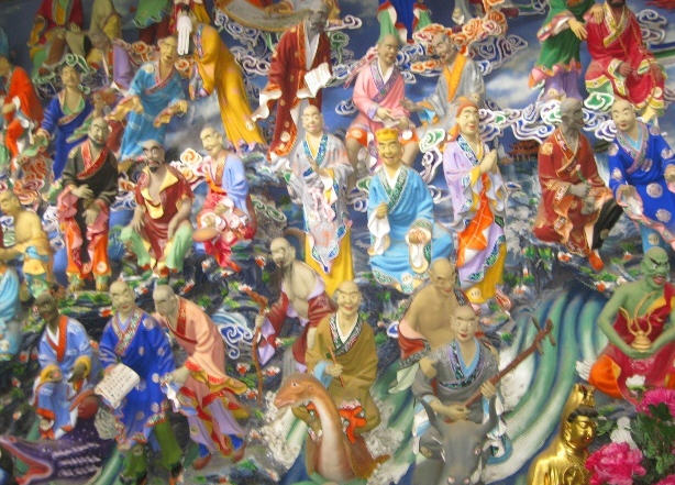 儒、释、道之外,云南昆明盘龙寺还多民间神祗。元和宫旁,有老财神殿,祖师殿东南,则有新财神殿,均供奉武财神赵公元帅,并有雄虎在旁,左有曹九功、利世仙官,右有招财童子、招财使者,香火自是不凡。更有趣者,大雄宝殿背面,释迦牟尼身后,除地藏菩萨、达摩祖师之外,还俨然立一关公塑像,相对于“文圣人”孔子,关公算是“武圣人”。在书中,其为儒将;在民间,其为法力广大之神祗,释迦亦兼收并蓄,纳入自已大殿之中,可见其肚量。
