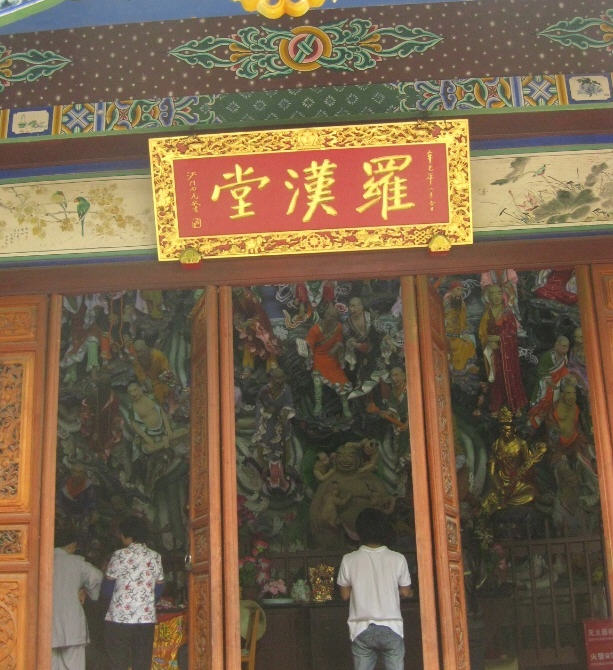 建于明万历年间的三圣接引殿中,迎面接引三佛高大轩昂,左右立十二圆觉菩萨,壁上原有大型壁画,彩绘道教之“八仙过海”,佛教之“西天取经:’,儒教之“孔子周游”,亦弥足珍贵。此殿原在寺门外东边,后毁,今迁建于祖师殿西南,诸菩萨依旧,两壁却一片空白,是为憾事。