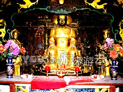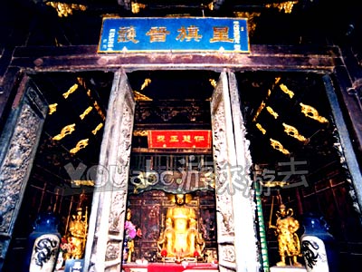 金殿位于昆明市东北郊7公里处的鸣凤山上,。俗话说:“山不在高,有仙则名”,鸣凤山山虽不高,却布满苍松翠柏,景色秀丽,空气清新,被誉为“一半青山一半云”。从山脚舍车步行,过迎仙桥,进“鸣凤胜景”坊,途径“第一天门”、“二天门”和“三天门”。攀上天门,即可见古朴庄重的“太和宫”大门。入寺门,再过棂星门,可见巍然屹立的砖城,长约数十丈,略似皇家紫禁城。沿阶进“城”,迎面高高的台阶上,便是太和宫的中心建筑,著名的金殿。据地方文献记载,金殿建于明朝万历三十年(公元1602年),因云南东川等地产铜,每年都要按规定数量运往湖北铸钱,后因战乱无法将铜运往湖北,当时鹦鹉山道长徐正元便请巡抚陈用宾和世袭黔国公沐昌祚,仿照湖北武当山七十二峰的中峰铜殿建造,冶铜铸成殿宇,供奉“北极真武大帝”取名为“太和宫”崇祯十年张凤翮巡云南时,将殿宇移往宾川鸡足山。现存鸣凤山金殿,是清初吴三桂重建的。殿梁上还留有“大清康熙十年,岁次辛亥,大吕月,十有门日之吉,平西亲王吴三桂敬筑”等字样。金殿高6.7米,宽7.8米,深7.8米,占地180平方米。殿内有精铸道教崇奉的“北极真武大帝”高2米多,两旁的金童玉女,高如常人,四面铜墙均为铜铸格子门,雕刻线条流畅,形象生动。所用建造金殿的铜约250多吨,是中国最大的铜铸殿。国务院将金殿列为全国重点文物保护单位 金殿东南有一座“明钟楼”。楼为三层,有36戗角,琉璃宝顶,高约30米。三楼悬一大口铜钟,高2.1米, 口径周长6.7米,壁厚15厘米,重14吨。 钟上铸有“大明永乐二十一年岁在癸卯仲春吉日造”等字样,为公元1432年所铸,至今已有560年的历史。此钟原悬昆明场面人宣化楼(近日楼西南面),拆除宣化楼时搬至古幢公园。为保护这一文物,政府又将此钟移至金殿,并拨款于1983年修建了这座钟楼。它是鸣凤山上的最高建筑,登楼四望,视野极阔,是东郊远眺的理想之地。