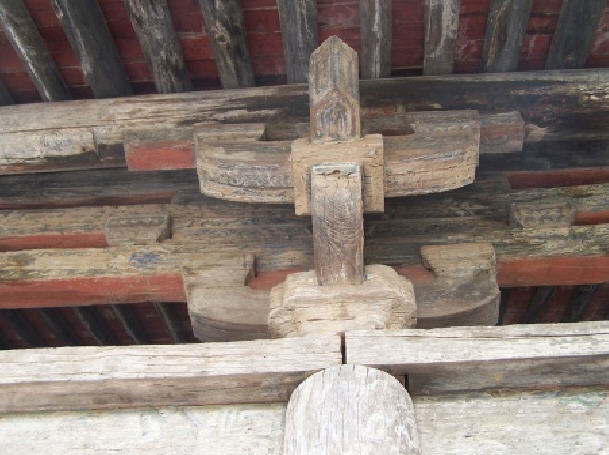 跨过门槛,步入佛殿,只见正中间 是三尊彩塑佛像,中为如来佛,两边分别为东方琉璃世界药师佛和西方极乐世界阿弥陀佛。余庆禅院本只由佛殿、廊房和钟楼、鼓楼组成,不知何年何月,钟、鼓楼 损坏不复存在,只留下钟和鼓置于佛殿前面,两边廊房原为僧人居住,到1982年,最后一名僧人去世,这些房间就另作他用,如今整座禅院也就只这佛殿“精华 荟萃”了。可也别小瞧了这佛殿,它虽比不上沿海地区那些寺院气势恢宏、金碧辉煌,但里头却大有名堂。先看这三尊佛像,他们嘴唇上竟留有胡须,目前在国内倒 是难得见到这般尊容。原来,最初的印度佛像也都留有蝌蚪式的胡须,元代以后,中原大地上的大佛年轻了,不再饰以胡须。由此推断,眼前这三尊佛像就是宋、金 时代的彩塑了。