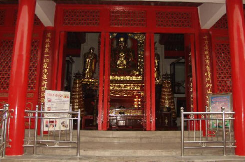 穿过庭院,第二进便是大雄宝殿,殿宇宏敞,能容数百人。正中供奉佛祖释迦牟尼,左供阿难,右供迦叶;佛像庄严肃穆,金碧辉煌。殿中高挂琉璃灯一盏,日夜长明。东西两侧分供十八罗汉,鎏金塑像,姿态各异,栩栩如生。殿后朝北是千佛山,手持观音瓶的观音大士塑像,站立在鳌鱼头上。身后为五彩泥塑,其中有大海波涛、仙山峻岭、龙宫贝阙、猴王洞府以及大小佛像,不可尽数。殿东除客厅、僧房、饭堂外,还有引人入胜的园林建筑环碧山房,两楹一厢,清礼部主事严绍曾题其额。这是当年冶春后社诗人江石溪、林小圃、凌仁山、严绍曾、王景琦等骚人墨客吟诗聚会地之一。殿西是念佛堂,为尼僧、居士听法师讲经的场所。