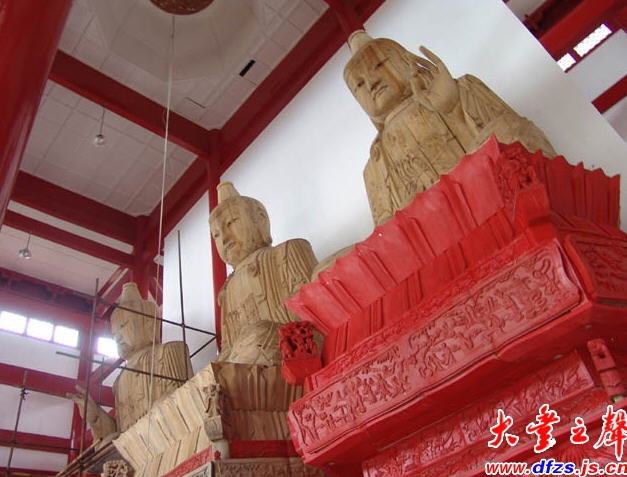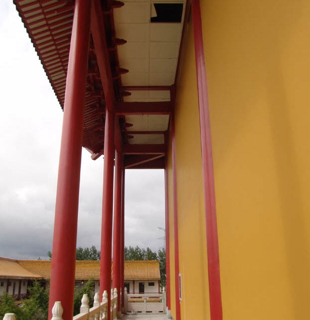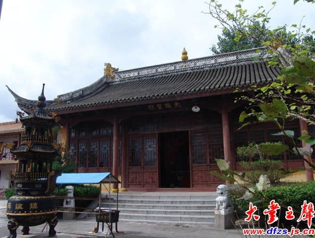 大雄宝殿屋脊正中,是一镇恶去邪的巨大葫芦,另悬以双狮戏球吊挂。东西两侧是八仙过海浮雕,神态各异,屋脊东西两头,各有一条吞云吐雾,跃跃欲飞的巨龙。大殿四檐翼然,亦有威风凛凛的四龙分镇。大雄宝殿之内,正中"万德尊严"的佛龛,龛内为面目慈祥,端坐荷台的如来佛。叶迦、阿傩侍立两旁,如来佛前是慈颜常笑,大肚能容的弥勒佛。琉璃灯高悬,香烟袅绕。北京广济寺、江苏佛教协会、香港佛教联合会、香港佛教僧枷会、世界佛教僧枷会联合敬贺的"慈云普覆"大红贺幛悬挂在大殿上方。
