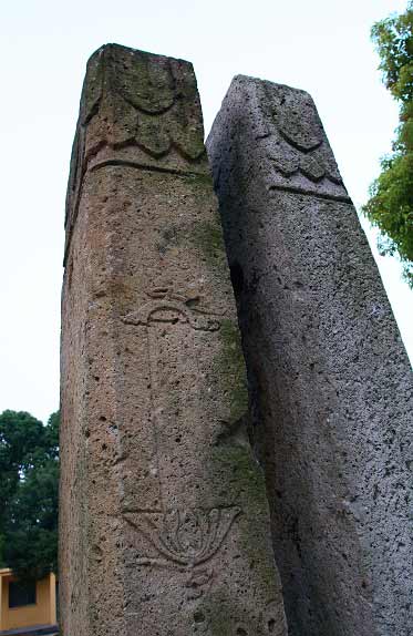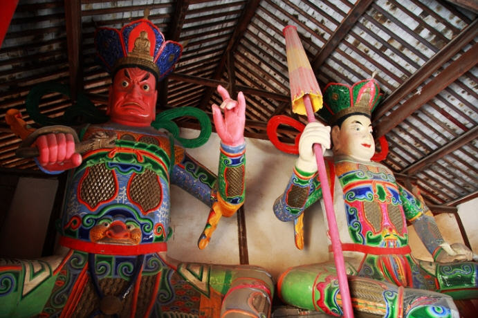 最先引人注意的是树在前面的两块高高的长方形石条,仔细看原来是用来树旗杆的,上面隐约刻着文字和图案,但已模糊看不清了。在南面有一水潭,因为西面一座小桥,所以不知原来是河还是庙前的水池。在潭边有几块很大的石头,从残留的石刻知道这是寺庙从前建筑的遗迹,想当年它们会是多么气势雄伟,如今只能静静地躺着与倒在这里的香灰相伴,前面还有两座石塔,是后人新刻的,不知从它们身上能否看到那残石的影子。边上还有一块石头,从不同的角度看像猪、像鱼、像兽……也许称得上是寺庙的一个宝贝了。